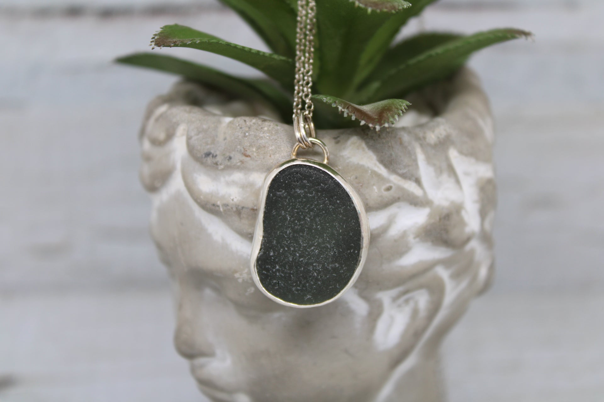 This striking piece of large grey sea glass was found along the sun-drenched shores of Bonaire in the Caribbean. Weathered smooth by salt, surf, and time, its soft matte finish and smoky hue evoke the quiet strength of the sea. Set in sterling silver, it’s a bold and beautiful reminder of ocean tides and island breezes ~ truly one of a kind.